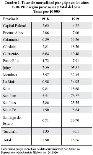 En el cuadro 2 se pueden apreciar las características que asumió la gripe en las provincias argentinas durante los dos años analizados: las provincias del centro y litoral argentino Buenos Aires, Capital Federal, Córdoba, Corrientes, Entre Ríos y Santa Fe y de la región de Cuyo Mendoza y San Luis multiplicaron su tasa de mortalidad entre 1918 y 1919 entre 2 y 6 veces. Paralelamente, las provincias del norte Catamarca, Jujuy, La Rioja, Salta, Santiago del Estero, Tucumán y San Juan8 multiplicaron su tasa de mortalidad entre 11 y 133 veces.