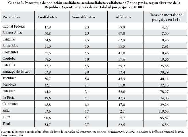 La vinculación entre la tasa de mortalidad por gripe y las tasas de analfabetismo por provincia, indicadoras de condiciones de vida de la población, permite apreciar una notable relación entre ambas; aquellas provincias que mostraban una alta tasa de analfabetismo tenían también una alta tasa de mortalidad por gripe, y éstas eran, justamente, las provincias del norte, con excepción del caso de la de San Juan (en la región de Cuyo), cuyo índice de analfabetismo era medio pero su mortalidad alta, y el caso de Corrientes, con un índice mayor de analfabetismo y una tasa menor de mortalidad por gripe.