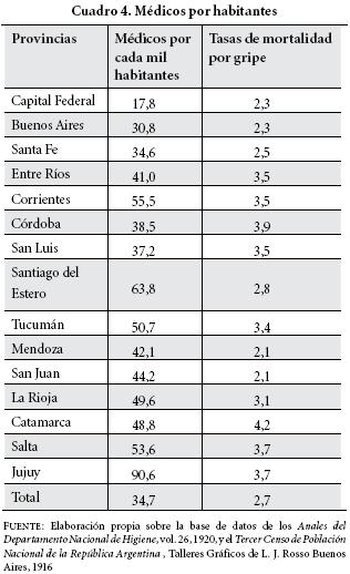 Paralelamente, las provincias de Corrientes y San Juan no entran en ninguna de estas categorías por dos fenómenos distintos: Corrientes tenía una baja mortalidad por gripe en relación con el escaso número de médicos, aunque un poco superior a otras provincias, mientras que San Juan presentaba tasas de mortalidad similares a las de las provincias norteñas, pero con un número de médicos por habitantes casi igual al de Corrientes.