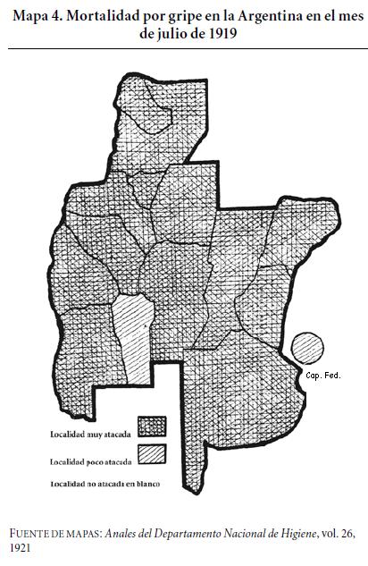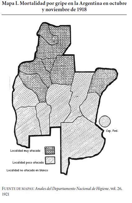 La mayor mortalidad, según el Departamento Nacional de Higiene, se dio en las provincias del norte argentino y en menor medida en las provincias del centro, es decir, los distritos que ingresaron más rapidamente en el esquema económico y social impuesto por la élite gobernante. Frente a este mapa cabría la siguiente hipótesis: las provincias atacadas en primer lugar serían aquellas que en 1918 no habían sido aún afectadas por la gripe y en las que se generó en un contexto de grandes bolsones de pobreza y sin los anticuerpos necesarios una alta mortalidad. Esto determinaría que, en términos de mortalidad, la gripe hubiese sido más grave en aquellas provincias y menor en las provincias centrales. En lo referido a la morbilidad, el panorama sería uniforme.