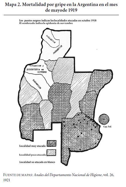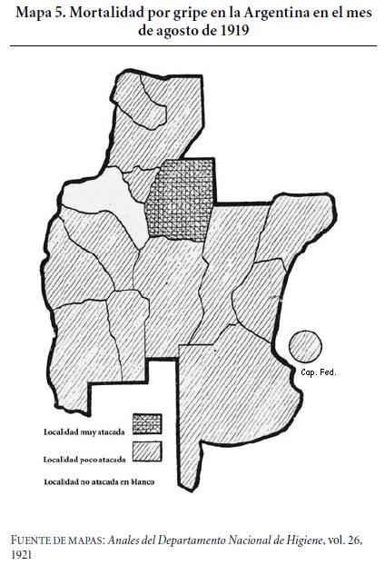 Tras este seguimiento podemos, entonces, sostener una idea más clara acerca del camino recorrido por la gripe: su ingreso al país se dio por el puerto de la ciudad de Buenos Aires y en octubre de 1918 impactó en las provincias del litoral, con una arremetida más leve en el norte argentino. Sin embargo, hubo un rebrote en 1919 que comenzó con gran intensidad en las provincias del norte y que se caracterizó por una alta mortalidad, con tasas superiores a la media nacional, como sucedió en los casos de Salta, Jujuy, Catamarca, Tucumán y Santiago del Estero, donde la gripe perduró entre dos y tres meses.