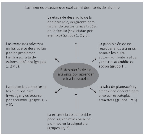 Las razones del desinterés para algunos maestros se relacionan con los problemas familiares y el entorno social adverso; esto es, aspectos ajenos al ejercicio de su docencia, como puede observarse en el siguiente esquema, tomado de Chávez (2013, p. 144).
