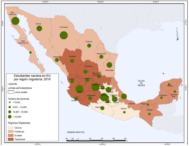 Mapa. Estudiantes nacidos en Estados Unidos por región migratoria, 2014.