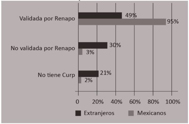 En tercer lugar, existe una diferencia importante en cuanto a los documentos de identidad oficial que poseen los estudiantes mexicoamericanos y los nacidos en México, lo cual impacta directamente en su transición entre niveles educativos. Más de la mitad de los alumnos nacidos en el extranjero carecen de la Clave Única de Registro de Población (CURP), un instrumento de registro de identidad asignado a todas las personas que viven en el territorio nacional mexicano, así como a los mexicanos que residen en el extranjero. La CURP es un requisito indispensable para la inscripción al nivel medio superior en México de acuerdo con la SEP.