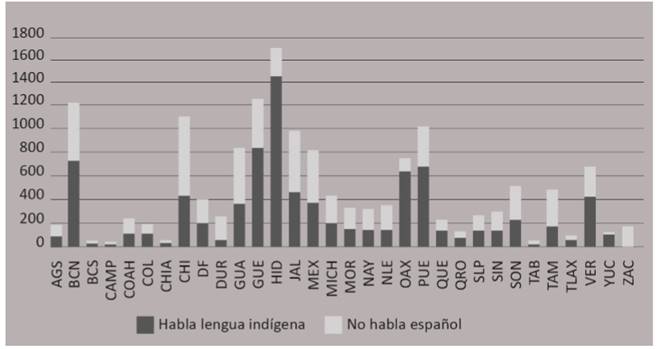 El CEMABE no identifica el nivel de dominio de español entre los alumnos, por ejemplo, la fluidez en la escritura, lectura o habla. En su lugar, señala si el alumno declara hablar una lengua, o no, lo cual es un indicador más laxo del conocimiento académico de una lengua. A pesar de esto, y a reserva de subestimar la población estudiantil que enfrenta alguna dificultad con la lengua de instrucción, existen alumnos mexicoamericanos que declararon “no hablar español”. Se concentran en estados de la región fronteriza, Baja California Norte y Chihuahua y en algunos de la región tradicional, como Guanajuato y Jalisco (ver gráfica 2).