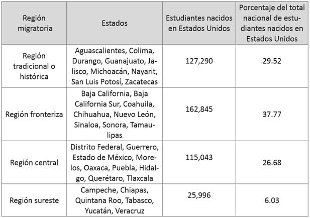 Así, observamos que casi un tercio de la niñez estadounidense en educación básica se encuentra en escuelas en los estados de Aguascalientes, Colima, Durango, Guanajuato, Jalisco, Michoacán, Nayarit, San Luis Potosí y Zacatecas. De hecho, los estudios pioneros de estudiantes transnacionales realizados por Zúñiga, Hamman y Sánchez (2008) se han concentrado en esta región, específicamente en Zacatecas. Esto sugiere que, si bien la región tradicional ha reducido su participación en el flujo migratorio México-EUA, aún se considera un destino importante para el retorno en virtud de la consolidación de redes sociales transnacionales.