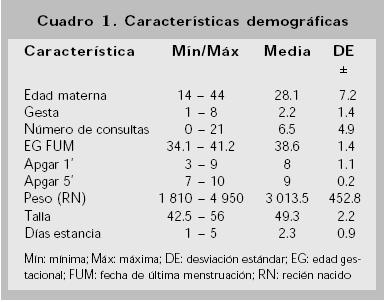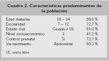 En esta población predominó el grupo de edad entre 18 a 34 años, la escolaridad de 712 años (secundaria, preparatoria o su equivalente en carrera técnica), el nivel socioeconómico tres (clase media), el estado civil casado o en unión libre; la vía de nacimiento abdominal y el control prenatal (cinco consultas o más) (Cuadro 2).