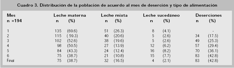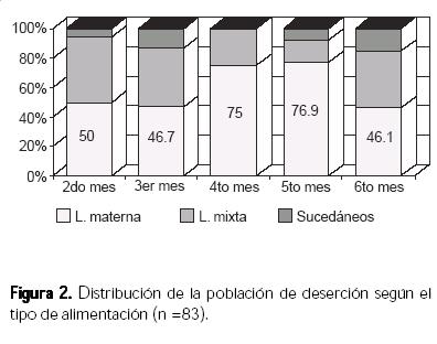 En la figura 2 se muestra el tipo de alimentación encontrada al momento de la deserción en los diferentes meses, observándose un predominio a favor de la lactancia materna exclusiva, especialmente en los meses cuarto y quinto del seguimiento.