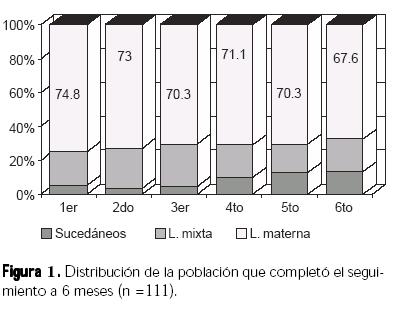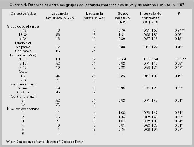 Resultados. Completaron seguimiento 111; 75 (67.6%) con lactancia materna exclusiva, 32 (28.8%) con lactancia mixta, y 4 (3.6%) con sucedáneos. En el grupo con escolaridad de 0 a 6 años se encontró un riesgo relativo de 1.29, intervalo de confianza de 1.09, 1.84, P =0.11 (prueba exacta de Fisher).