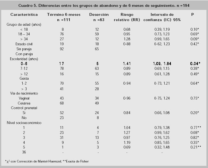 Al comparar el grupo de deserción (83) y el que completó el seguimiento a seis meses (111), nuevamente el grupo con escolaridad de cero a seis años terminó más el seguimiento a seis meses con un RR de 1.41 y un IC al 95% de 1.09,1.84, con una P =0.04 (corrección de MantelHaenszel) (Cuadro 5).