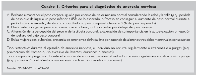 Como en cualquier padecimiento, la facilidad vs la dificultad para establecer el diagnóstico está en relación con la experiencia del clínico que observa el caso en cuestión. Así, numerosos textos médicos enfatizan lo elusivo del diagnóstico, en tanto que otros autores subrayan que la mayoría de los pacientes que acuden ante ellos, ya se han autodiagnosticado. Al no existir ningún marcador bioquímico de la anorexia, se han propuesto una serie de criterios de diagnósticos, siendo los más utilizados en la actualidad los del Diagnostic and Statistical Manual of Mental Disorders (DSM-IV-TR)40 (Cuadro 1).