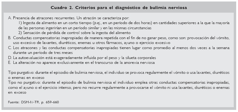 Al igual que en la anorexia, al no existir ningún marcador bioquímico de la bulimia, se han propuesto una serie de criterios diagnósticos siendo también los más utilizados en la actualidad los del Diagnostic and Statistical Manual of Mental Disorders (DSM-IV-TR)40 (Cuadro 2).