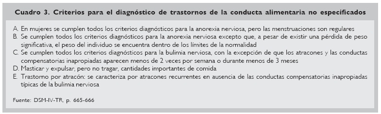 La categoría de TANE se refiere a los trastornos de la conducta alimentaria que no cumplen los criterios para ninguno de los trastornos específicos reconocidos en el DSM-IV-TR. En el cuadro 3 se indican los diferentes tipos existentes.