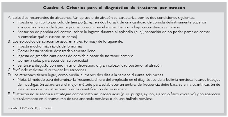 Al igual que en los padecimientos antes descritos, se han propuesto una serie de criterios diagnósticos, siendo también los más utilizados en la actualidad los del Diagnostic and Statistical Manual of Mental Disorders (DSM-IV-TR) (Cuadro 4).40