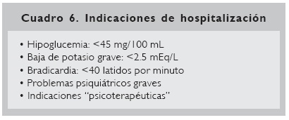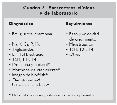 Los parámetros clínicos y de laboratorio a seguir por el internista o endocrinólogo, a fin de evitar mortalidad en pacientes con anorexia nerviosa se muestran en los cuadros 5 y 6.