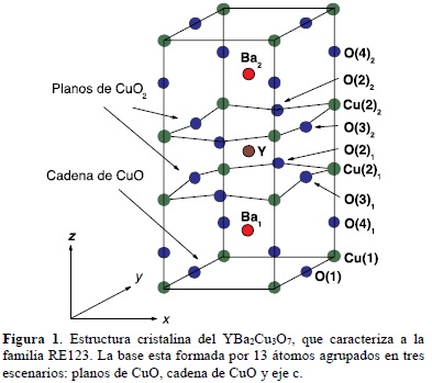 La familia Re123 posee dos estructuras formadas por átomos de Cu y O dentro de la celda unitaria llamadas planos de CuO (como se muestra en la figura 1). En los planos de CuO existe una pequeña distorsión que destruye la bidimensionalidad y está relacionada con las propiedades superconductoras de los sistemas [19]. Estos planos también le confieren una gran anisotropía a las propiedades electrónicas en el estado normal y superconductor [1]. Otra estructura formada por átomos de Cu y O, llamada cadena de CuO, posee un carácter bidimensional, y propiedades superconductoras, posiblemente debido a un efecto de proximidad [20]. También, actúa como fuente de carga para los planos de CuO.