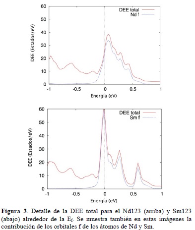 La estructura de bandas electrónicas y la DEE para los sistemas Y123 y Nd123 han sido calculadas previamente [26-28]. En la figura 2 se muestra la DEE total para los tres sistemas estudiados en este trabajo, en donde la Ef se encuentra ubicada en cero. La DEE total del Y123 concuerda con lo reportado en trabajos anteriores [25,26] en donde se utilizaron métodos derivados de la teoría de los funcionales de la densidad. En el caso del Nd123, lo reportado con anterioridad [28], utiliza una aproximación de amarre fuerte, y no se incluyen orbitales f en la aproximación.
