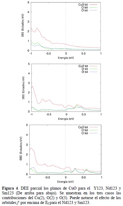 Si se comparan las contribuciones de los diferentes escenarios de los sistemas considerados en este trabajo, vemos que para del Nd123, la DEE de los planos de CuO disminuye 31% en el nivel de Fermi respecto al Y123, y aumenta 28% para el Sm123. Estos cambios podrían provocar el debilitamiento o fortalecimiento de la superconductividad en estos sistemas, acorde a la teoría BCS [30], y ser la causa de las diferencias en los diagramas de fase T-R que existen entre los tres sistemas.