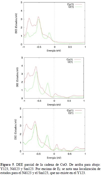 También ocurre un proceso de localización de estados en las DEE parciales de los planos de CuO para el Nd123 y Sm123 por encima de la Ef. Esta localización es debida a los orbitales f de las tierras raras. Una situación interesante ocurre en la DEE asociada a la cadena de CuO de los dos sistemas, en la cual también ocurre la localización antes mencionada.