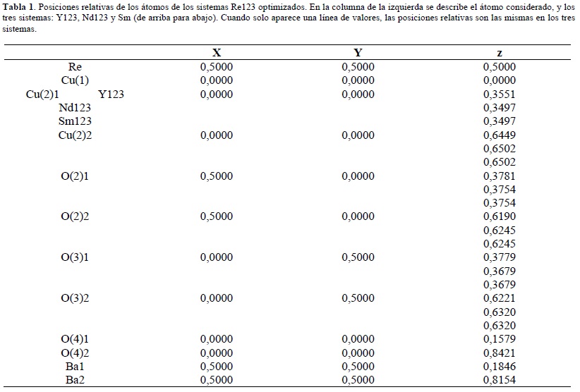 En la tabla 1 se muestran las posiciones relativas de los átomos de los sistemas Re123 después de realizar la optimización. Como se puede apreciar, para los sistemas Nd123 y Sm123, las posiciones coinciden.