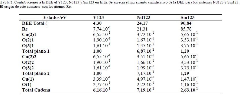 En la tabla 2 se muestra en detalle cada una de las contribuciones por parte de los diferentes escenarios que forman los sistemas RE123. Para el sistema de referencia: Y123, la contribución principal a la DEE total en Ef proviene de los dos planos del CuO: 46%; la cadena contribuye con el 14%. Las contribuciones de los Oxígenos O(2) y O(3) son casi idénticas, mostrando el efecto limitado que tiene la fase cristalina ortorrómbica en los planos. La participación de los Cu(1) y Cu(2) en la DEE es casi igual, siendo la suma de los dos Cu(2) de 30%, y la del Cu(1) 14%. Los Oxígenos O(4) contribuyen en conjunto con el 11% a la DEE total.