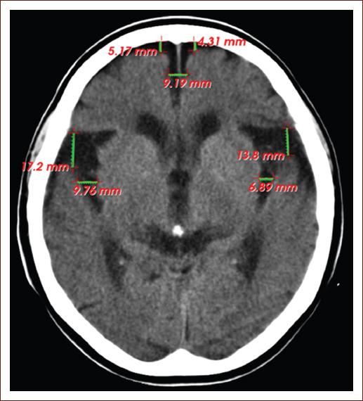 Figure 1 Computed tomography image of the simple skull of a 75-year-old patient, without neurologic focalization signs, showing signs of cerebral atrophy with deepening of the grooves at the frontal level (5.17 and 4.31 mm, respectively), of the anterior portion of the interhemispheric fissure (9.19 mm) and dilation of the grooves of Silvio (17.2 and 13.8 mm on both sides) and Rolando (9.76 and 6.89 mm on both sides) (source: Imaging Department, Juan Bruno Zayas Alfonso Hospital).