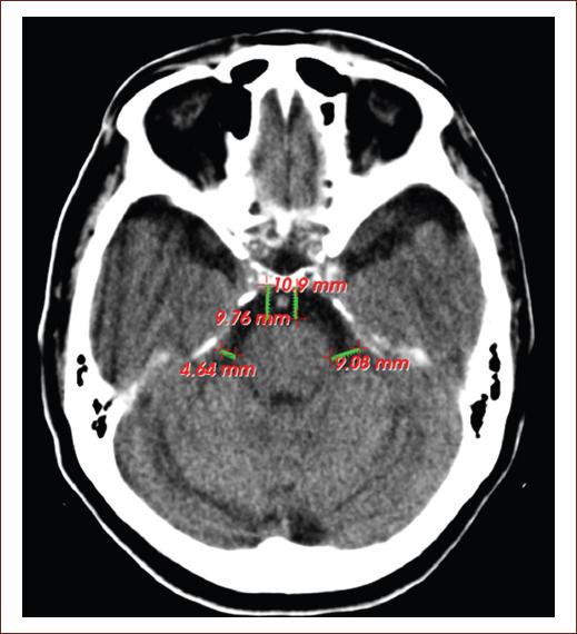 Figure 2 Computed tomography image of the simple skull of a 75-year-old patient, without neurologic focalization signs, it showing signs of cerebral atrophy at the level of the prechiasmatic cisterns (9.76 and 10.9 mm) and the cerebellar ponto angle (4.64 and 9.08 mm) on both sides (source: Imaging Department, Juan Bruno Zayas Alfonso Hospital).