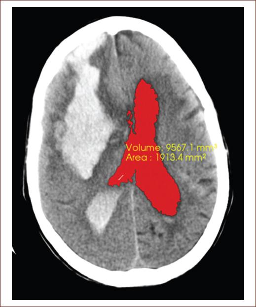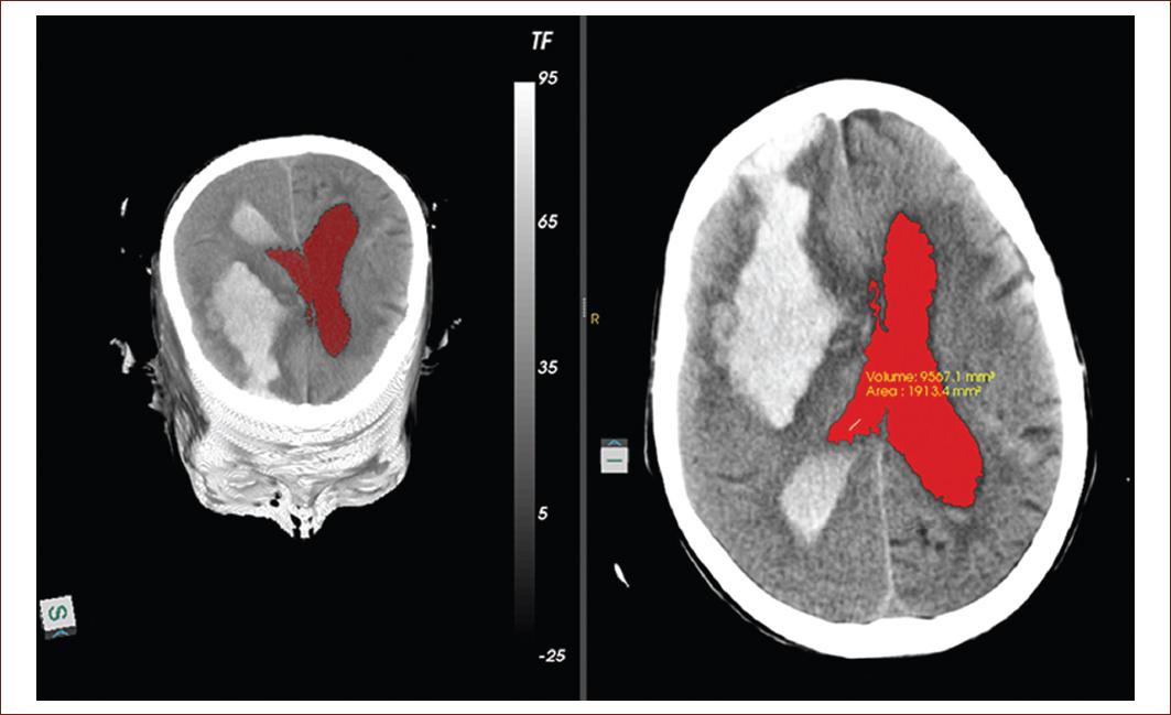 Figure 3 Computed tomography image of the simple skull of an 82-year-old patient, with neurologic focalization signs related to full down, showing a recent hemorrhagic focus of 82 right front parietal HU, measuring 93.6 mm × 41.1 mm that floods the ventricular system, note the blood content in both occipital horns a predominance of the right side, associated with perilesional edema that clears the cerebral sulci at that level, collapsing the right frontal horn and compressing the body of the right lateral ventricle, which displaces the midline to 8 mm to the left. The segmentation of the lateral ventricles was performed, getting the volume 9988.4 mm3 and area 1977.7 mm2 obtained in this tomography slice (source: taken from the Imaging Department, Juan Bruno Zayas Alfonso Hospital).