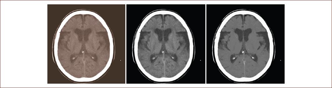 Figure 5 Left: original Digital Imaging and Communications in Medicine image of a simple raw skull computed tomography. Center: result of applying the curvature flow image filter. Right: result obtained by applying segmentation based on homogeneity indicators during the pre-processing stage (source: taken from the Imaging Department, Juan Bruno Zayas Alfonso Hospital).