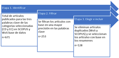 Etapa 3. En esta atapa se refinó la base de datos descartando los artículos duplicados en las bases WoS y SCOPUS; además se descartaron los artículos que no abordaban las áreas del conocimiento sobre administración de negocios, ciencias económico-administrativas, finanzas, ciencias administrativas. Además, los artículos se sometieron a un análisis detallado de sus resúmenes para identificar los temas sobre capacidades dinámicas (CD) y economía circular (EC) en las organizaciones destacando los aspectos de sostenibilidad. La selección final fue de 128 artículos que se utilizaron para realizar el análisis bibliométrico.
