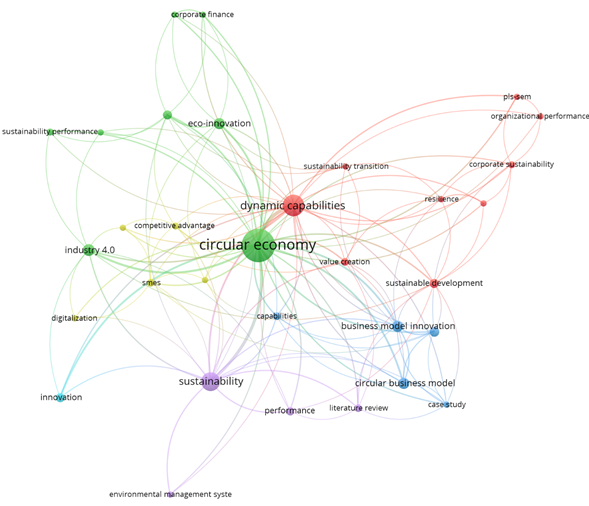 Figura 3 Co-ocurrencia de las palabras clave usadas por el autor separadas por clústeres sobre las capacidades dinámicas y la economía circular, 2015-2022.