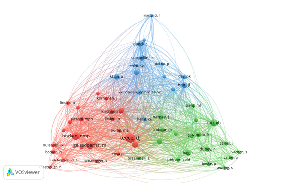 El último clúster de pensamiento (color verde) se centra en el estudio de la cadena de suministro verde e industria 4.0. Sus trabajos estudian el perfil de la cadena de suministro de circuito cerrado, la eco innovación, economía circular y están dirigidos por los autores más co-citados, Bag (Bag et al., 2021, 2022; Bag, Wood, et al., 2020; Bag, Yadav, et al., 2020) y Zhu (Zhu et al., 2012). Este clúster desarrolla conocimiento sobre los procesos mediante los cuales las organizaciones aumentan la eficiencia y eficacia de EC, CD y DS. Los clústeres rojo y verde son los más grandes, tanto en términos del número de académicos como de la magnitud del impacto (es decir, el tamaño del nodo), destacando en la red a Teece et al., (1997) y Teece y Pisano, (1994) en los tres ejes de análisis.