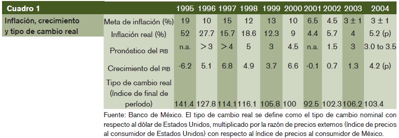 Por ejemplo, luego de la fuerte depreciación del tipo de cambio real de 1995 se ha observado un paulatino proceso de apreciación que sólo se interrumpió entre 2002 y 2003. De este modo, el tipo de cambio real de finales de 1995 a 2002 se apreció cerca de 35, y 27% de 1995 a 2004. Este comportamiento, junto con un tipo de cambio nominal relativamente estable y una economía más abierta, ha implicado que el gobierno contribuya de manera sustancial a reducir presiones inflacionarias. Sin embargo, la misma sobrevaluación del tipo de cambio real ha incidido negativamente en el nivel de competitividad de la economía y, por tanto, ha contribuido también al pobre desempeño económico.