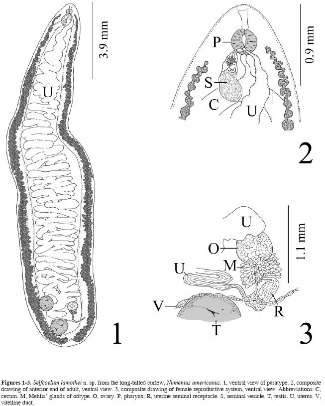 As mentioned above, Cyclocoelum obscurum (Leidy, 1887) Harrah, 1922, reported from the body cavity and air sacs of 2 longbilled curlews from Texas (Dronen and Badley, 1979; also see Dubois, 1959 and LamotheArgumedo and OrozcoFlores, 2000), represents the only other cyclocoelid documented from this host (Table 1). While C. obscurum and S. lamothei n. sp. are within Cyclocoelinae, species of Selfcoelum differ from species of Cyclocoelum in the former having a postpharyngeal genital pore and the latter having a prepharyngeal genital pore (Dronen, 2007).