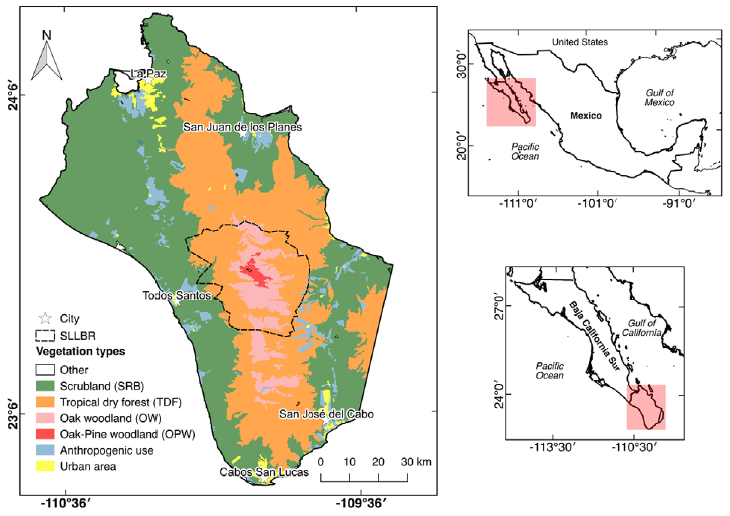 Four main vegetation community-types were obtained: scrubland (SRB) representing 50.69% of the study area and 3.32% for SLLBR area; tropical dry forest (TDF) 36.47% of the study area and 60.48% of SLLBR area; oak woodland (OW) 5.3% of the study area and 31.93% of SLLBR area; and oak-pine woodland (OPW) 0.45% of the study area and 3.96% for SLLBR area. Other areas were obtained as anthropogenic use (4.49%), urban area (2.11%), and another one catalogued as “other” representing mangroves and dunes, which is located out of the SLLBR area.