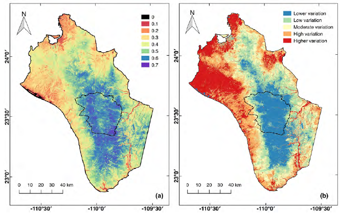 Table 2 Classification of the coefficient of variation (CV) of Normalised Difference Vegetation Index (NDVI) and its percentage of surface area, in the Cape region, Baja California Sur, Mexico during the growing season (September - November) for the study period (2001-2015).