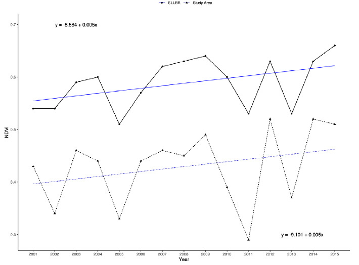 Figure 3 shows the general trend pattern of NDVI in the study area and the SLLBR polygon. As shown in this figure, from 2001 to 2015, an increasing pattern was observed in the NDVI values; the linear models suggested an increment of 0.005 per year in both the study area and the polygon. During the study period both areas had the lowest values in 2011 and the highest ones in 2014 and 2015. Spatial distribution of NDVI trend patterns are shown in figure 4a, which suggested that most of the study area had a positive and significant increase in the NDVI; however, areas close and within cities had a negative and significant decrease.