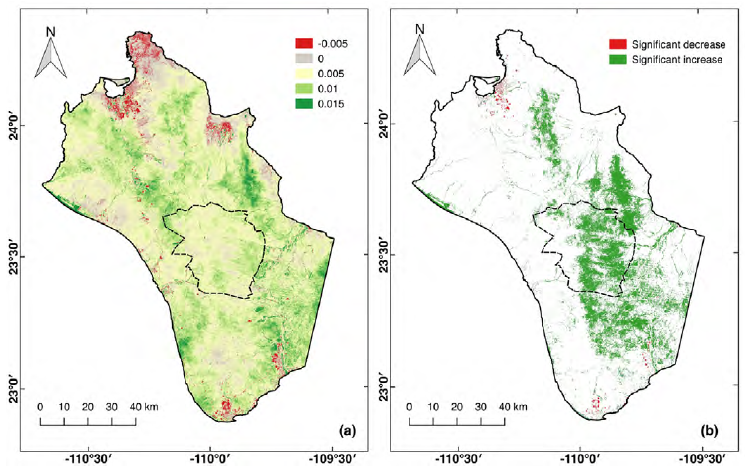 Figure 4 Spatial distribution of trend in the Normalised Difference Vegetation Index in the Cape Region, Baja California Sur, Mexico over the period from 2001-2015 in the growing season. a), NDVI trend; b), significance of the NDVI trend for each pixel.