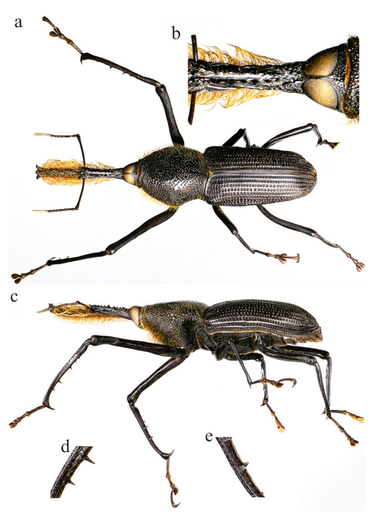 Figure 1 a) R. barbirostris, dorsal view; b) presence of a slightly raised frontal keel between the eyes; c) R. barbirostris in lateral view; d) tibia on inner edge with long teeth (male); e) front tibia without hairs (male).