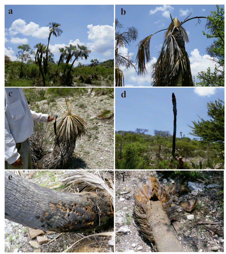 Rhinostomus barbirostris is distributed in approximately one-third of the Mexican territory (Campeche, Chiapas, Guerrero, Jalisco, Nayarit, Oaxaca, Puebla, Tabasco, Quintana Roo, Veracruz, and Yucatán), and there are few records of damage and affectation by this beetle (Conafor, 2020). Basic aspects of biology, distribution, strategies, and control measures in R. barbirostris have not yet been addressed in Mexico; therefore, the potential damage to palm populations in the territory is unknown. In Central and South America, the damage caused to palms has led to establishing control methods, the most practiced is the early removal of infested plants, in addition to treating them with insecticides and destroying them once the disease is diagnosed (Franqui-Rivera & Medina-Gaud, 2003). Recently, in Oaxaca (2020) and Puebla (2015) records of the bearded weevil in the sweet palm Brahea dulcis have been reported in communities of the Tehuacán-Cuicatlán Biosphere Reserve. The sweet palm native to Mexico and Central America is distinguished by its solitary stem, large leaves, and glaucous green color (Pavón et al., 2006; Rzedowski, 2006; SINAT & Semarnat, 2009). It lives in dry and semi-arid areas, mainly on limestone soils. It is found in a wide geographic region, from northern Veracruz to Central America, inhabiting diverse ecosystems such as dry forests, scrubland and oak forests (Quero, 1994). The main threat to the survival of this species is human activity. The unsustainable extraction of leaves for artisanal and construction purposes, together with extensive habitat degradation caused by agricultural expansion, livestock grazing, and urban development, has resulted in a pronounced reduction of its populations (Rangel-Landa et al., 2014; Rzedowski, 2006). In Mexico, the use of “Mexican sweet palm” is regulated by various laws and regulations, such as the General Wildlife Law and NOM-059-SEMARNAT-2001, which categorize species and establish protection measures (López-Serrano et al., 2021; Semarnat, 1997, 2002).