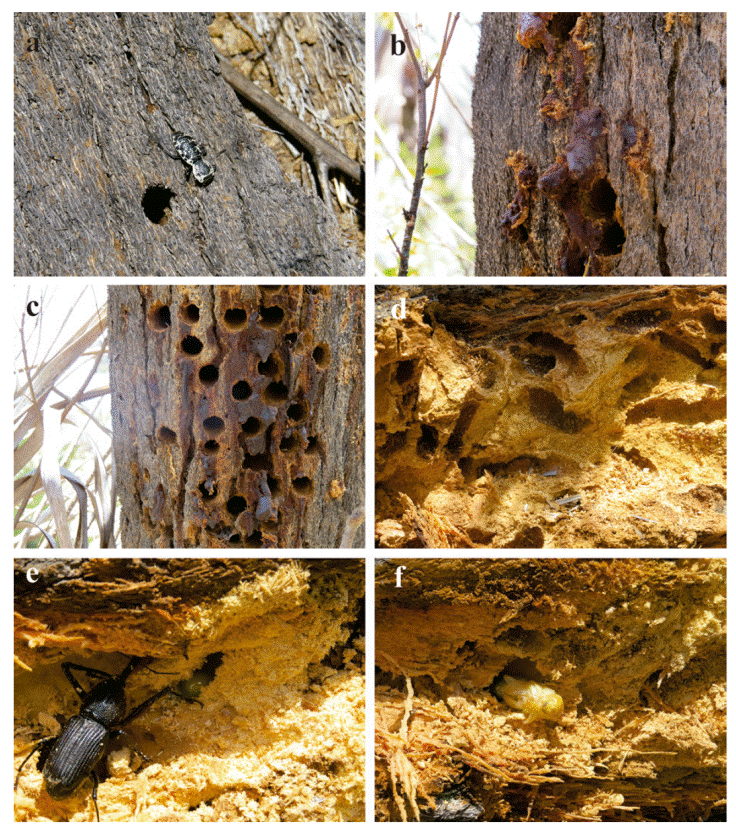 A single, distinct borehole in the trunk is created by an adult weevil for laying eggs or by larvae boring through the wood (Fig. 3a-b). The clean-cut appearance of the hole suggests recent activity (Fig. 3b). Numerous circular holes indicate the advance of colonization where multiple larvae have burrowed, compromising the structural integrity of the palm and contributing to its decline (Fig. 2f, 3a). Internal damage is characterized by a discolored and brittle texture of the bark, the texture of the wood appears spongy and degraded, illustrating the destruction caused by the feeding larvae (Fig. 3d-f).