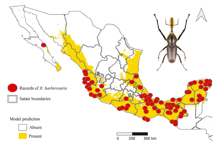 The historical, current, and potential distribution of R. barbirostris were determined using data obtained from various databases. Records were consulted and downloaded from the Global Biodiversity Information Facility (GBIF 2023), iNaturalist (2023). The specimens examined in this study were obtained from the following collections: AMNH (American Museum of Natural History, New York, USA.), ASU (Arizona State University, Charles W. O’Brien Collection), CEAM (Centro de Entomología y Acarologia, Instituto de Fitosanidad, Colegio de Postgraduados, Montecillos), CECR (Centro de Referencia, SENASICA-SAGARPA), Conafor (Comisión Nacional Forestal, México), CNIN-UNAM (Colección Nacional de Insectos, Universidad Nacional Autónoma de México), DGSV (Dirección General de Sanidad Vegetal, SENASICA), ECOSUR (El Colegio de la Frontera Sur, Colección Entomológica San Cristóbal y Tapachula, Chiapas, México), MZFC (Museo de Zoología, Facultad de Ciencias, UNAM, Mexico), and UACH (Universidad Autónoma Chapingo, Colección del Departamento Forestal).