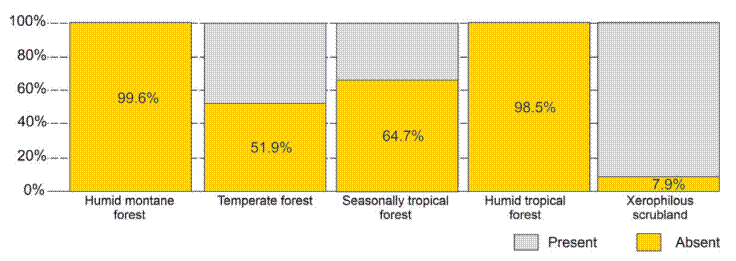 The potential distribution model covers almost the entire surface area in the national territory of 2 of the biomes: humid mountain forest (99.6%) and humid tropical forest (98.5%); in 2 others, close to half: temperate forest (51.9%) and seasonally dry tropical forest (64.7%); and only 7.9% in xerophilous scrubland (Fig. 5).