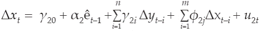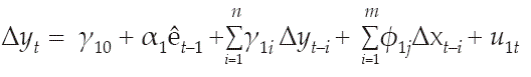 Los residuos de la ecuación de cointegración rezagados un periodo se representan con êt-1. A partir de este método de estimación, será posible probar la causalidad en el sentido de Granger (Rodríguez y Venegas, 2011).