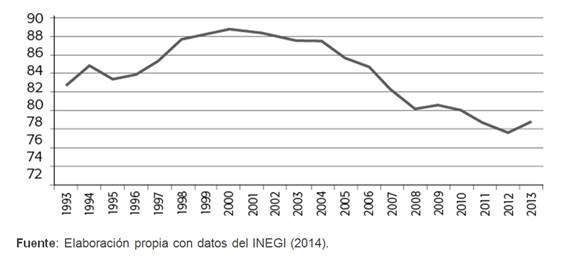 Por otro lado, la dependencia que México tiene del mercado estadunidense no ha cambiado sustancialmente: sigue siendo el principal para las exportaciones mexicanas. Si bien la Gráfica 1 muestra un comportamiento cíclico de los flujos comerciales externos, que representa el mercado de Estados Unidos para México desde 1993 hasta 2013 (con un aumento de los montos desde 1995, alcanzando un máximo en 2000, y una disminución desde ese año que algunos autores atribuyen a la entrada de China a la OMC en 2001), casi el 80 por ciento de las exportaciones totales del país tienen como destino al vecino país del Norte (después de un punto de inflexión al alza en 2012, que comienza a atribuirse a la pérdida de competitividad de China por el aumento de los costos de producción).