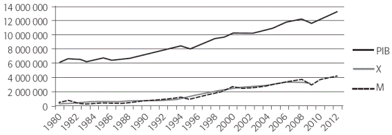 Gráfica 2 PIB, exportaciones (X) e importaciones (M) totales de México (1980-2012) (MDP de 2008)