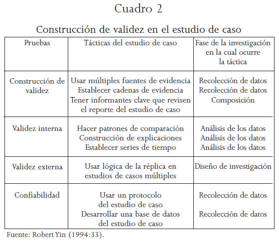 Robert Yin (1994) establece un esquema que sintetiza las medidas para vigilar la validez interna y externa del caso: