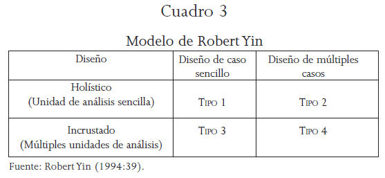 De acuerdo con el planteamiento de Yin, se trata de un estudio "incrustado" con múltiples casos. Adicionalmente, se busca generar instrumentos que respondan a las dos unidades básicas de observación para establecer la comparación entre los tres casos seleccionados.