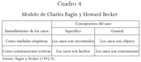 Finalmente, de acuerdo con la concepción de Ragin y Becker (1992), en esta investigación los casos se consideran como unidades empíricas. Es difícil establecer si se trata de casos encontrados o casos como objetos, ya que se van estableciendo unidades empíricas de análisis en el transcurso de la investigación, pero al mismo tiempo se utilizan definiciones existentes en investigaciones anteriores. Sin embargo, ellos mismos afirman que sus distinciones no son absolutas ya que el investigador transita por varias fases en el transcurso de su indagación.