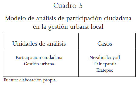 La otra cuestión es que se parte de la idea señalada por Yin (1994) sobre los principales elementos a considerar en la elaboración del estudio de caso; es decir, la definición de la unidad o unidades de análisis, que en el caso particular de esta investigación son dos: la gestión urbana y la participación ciudadana.